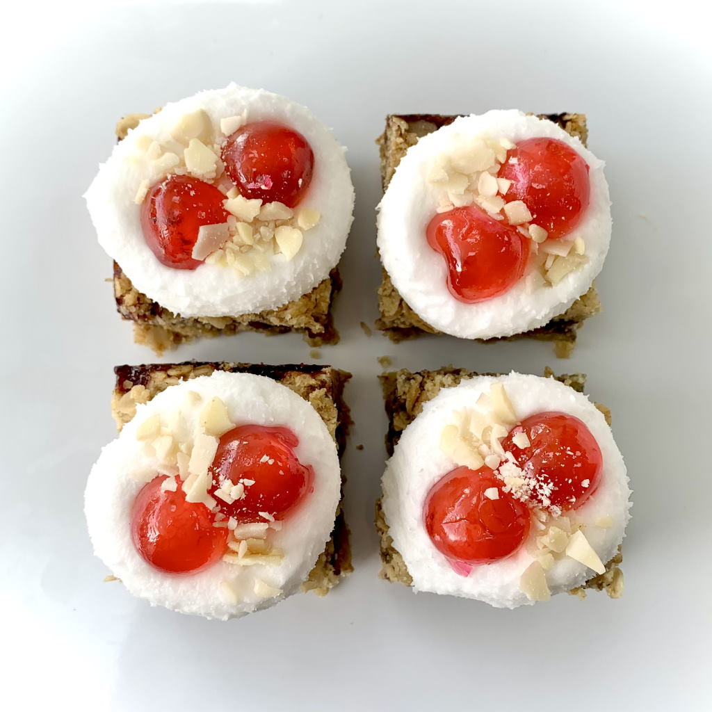 Our flapjack take on an English classic Cherry Bakewell. Lovely and nutty almond flapjack, a shot of sour cherry jam through the centre and not forgetting the unmistakable white icing with a shiny cherry on top.