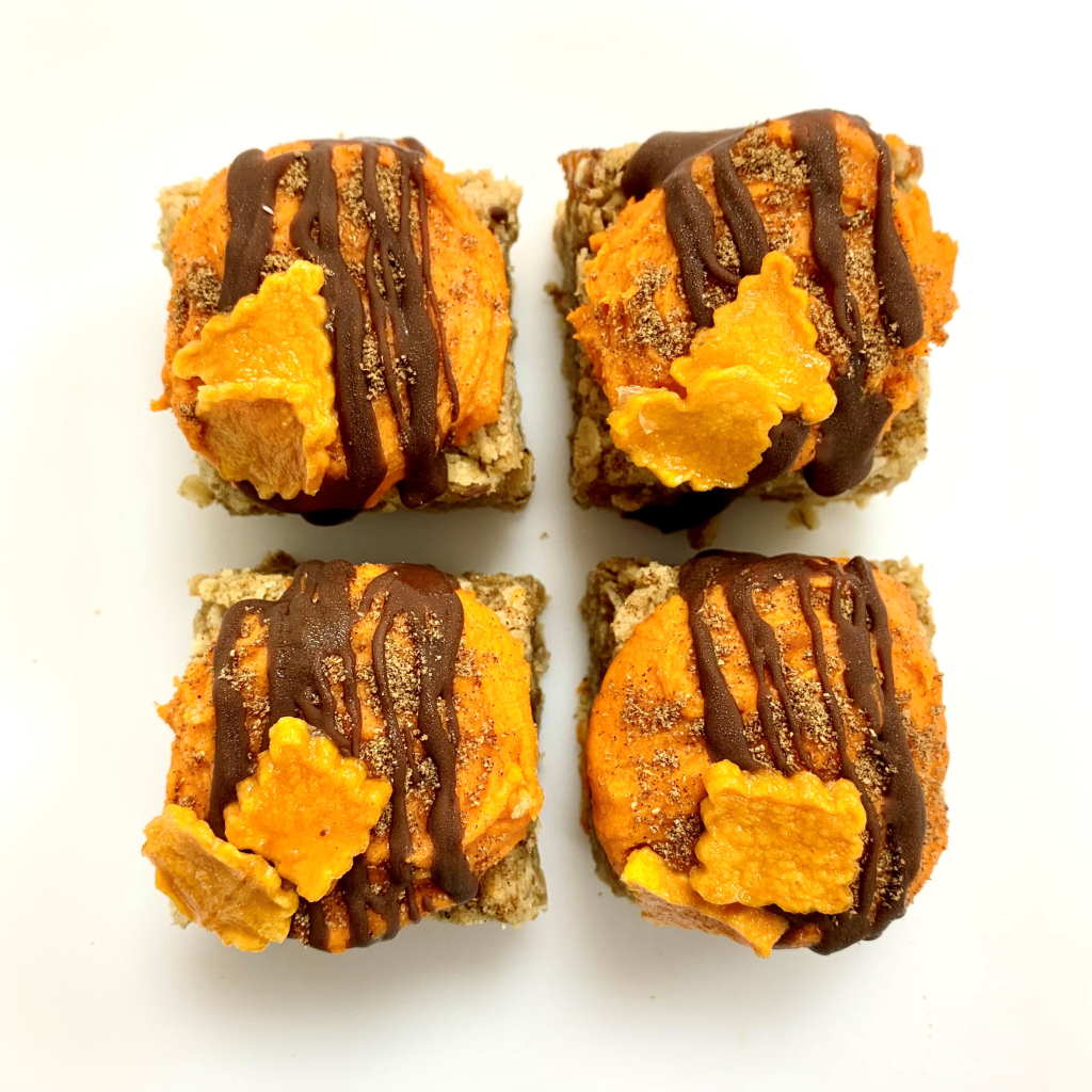 Autumn, Fall, Pumpkin Spice season. When the leaves turn golden, we all love PSL everything…so we’ve made a gorgeous flapjack to celebrate! Golden oaty base, pumpkin spice topping, a sprinkling of spice and a drizzle of milk chocolate, all finished off with candied squash like falling leaves. It’s as beautiful as it is delicious.