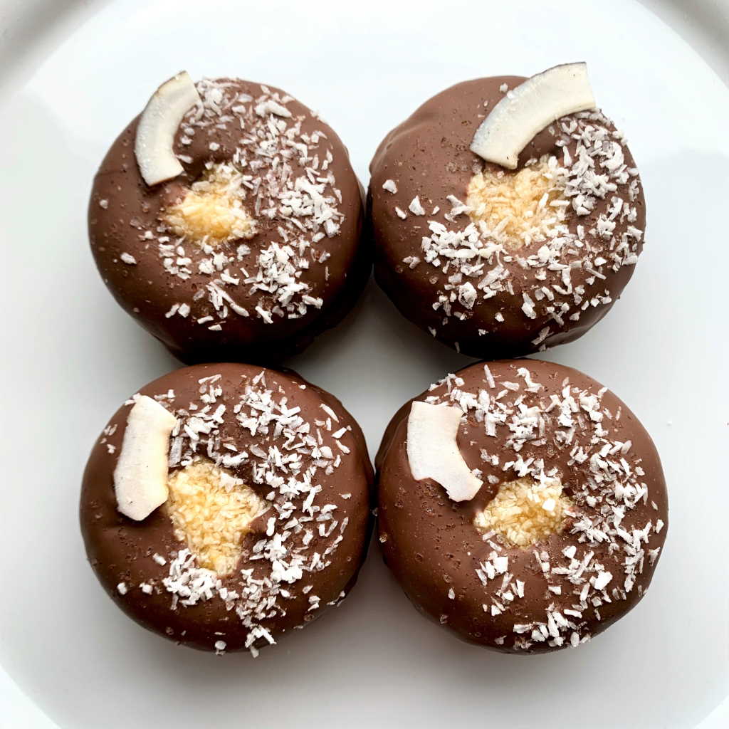 Your favourite coconut chocolate bar all grown up and completely vegan! Chocolate doughnut with a sweet coconut squidge centre, smothered with vegan milk chocolate and sprinkled with a confetti of organic desiccated coconut. Sounds good? Just wait until the pink Himalayan rock salt kicks in. Not only is it pretty, it takes the flavours to a whole other level! Bounty like you’ve never had before, gluten-free, vegan and baked.