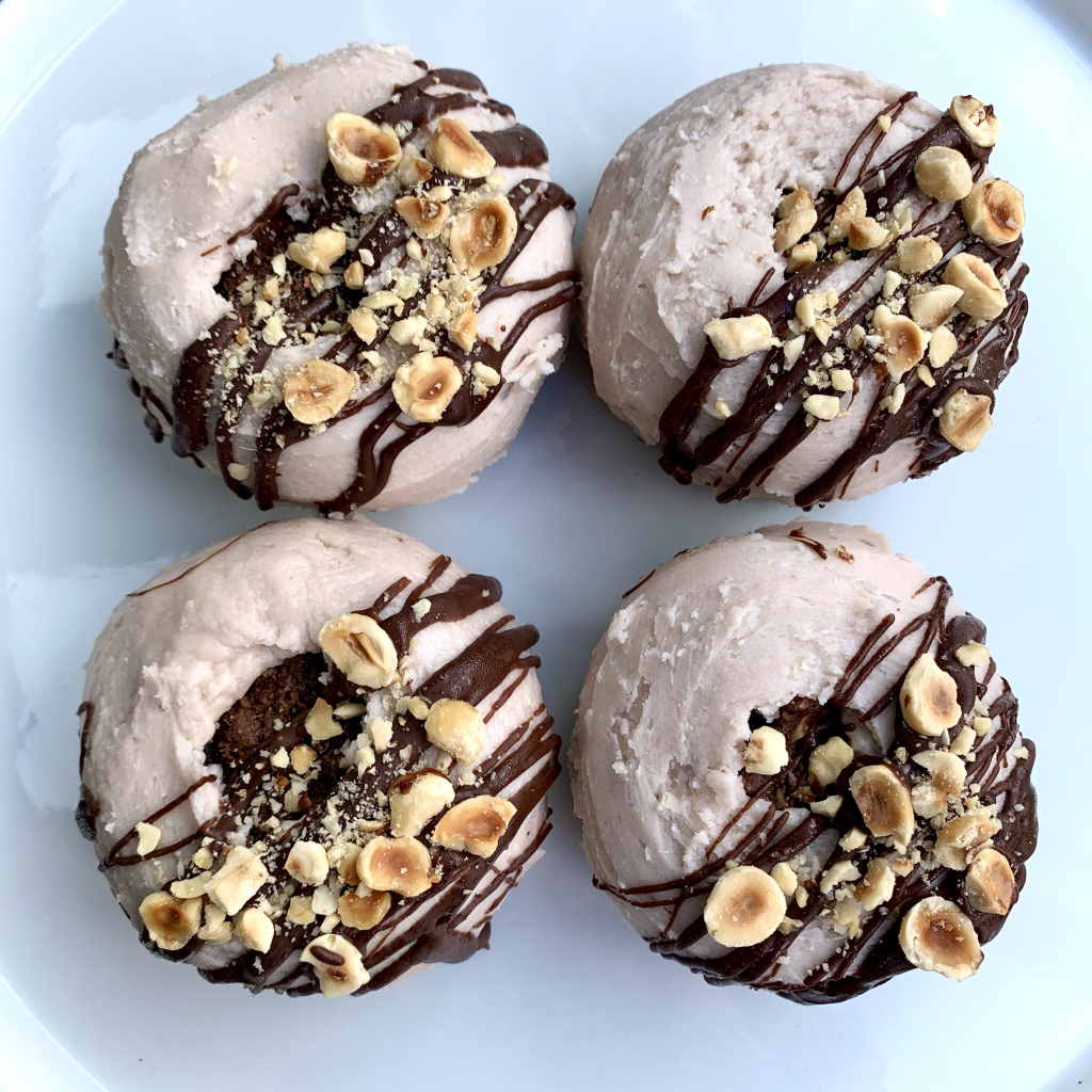 With these doughnuts, we are really spoiling you! This is our cake version of a Ferrero Rocher, with delicious chocolate base, hazelnut cream, dark milk chocolate drizzle and a cascade of crushed hazelnuts on top. So decadent, you’ll be transported straight to the ambassador’s party. And what’s more, it’s gluten-free, vegan and baked…no, really!